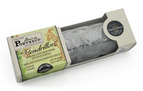 Le Cendrillon is an award-winning goat's milk cheese from La Maison Alexis de Portneuf in Quebec. With a mottled vegetable-ash rind hiding a smooth ivory paste, this goat cheese is tangy and full of flavour, acquiring notes of spiciness as it ages.
