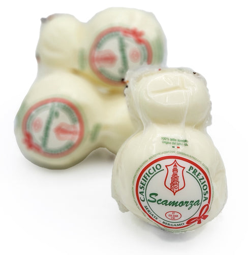 This delicious Scamorza cheese comes to us from the The Preziosa Dairy in Italy who pride themselves on quality mozzarella products made from fresh local milk. A close cousin to mozzarella, Scamorza is a pasta filata (stretched curd) cheese. This means the fresh curd matures in its own whey, taking on a spongy consistency. It is then dipped in hot water and stretched and folded into all sorts of fun shapes, with the most common being the pear shape you see here.