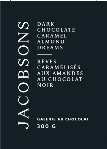 Decadent dark chocolate covered caramel and almond clusters. 300 g